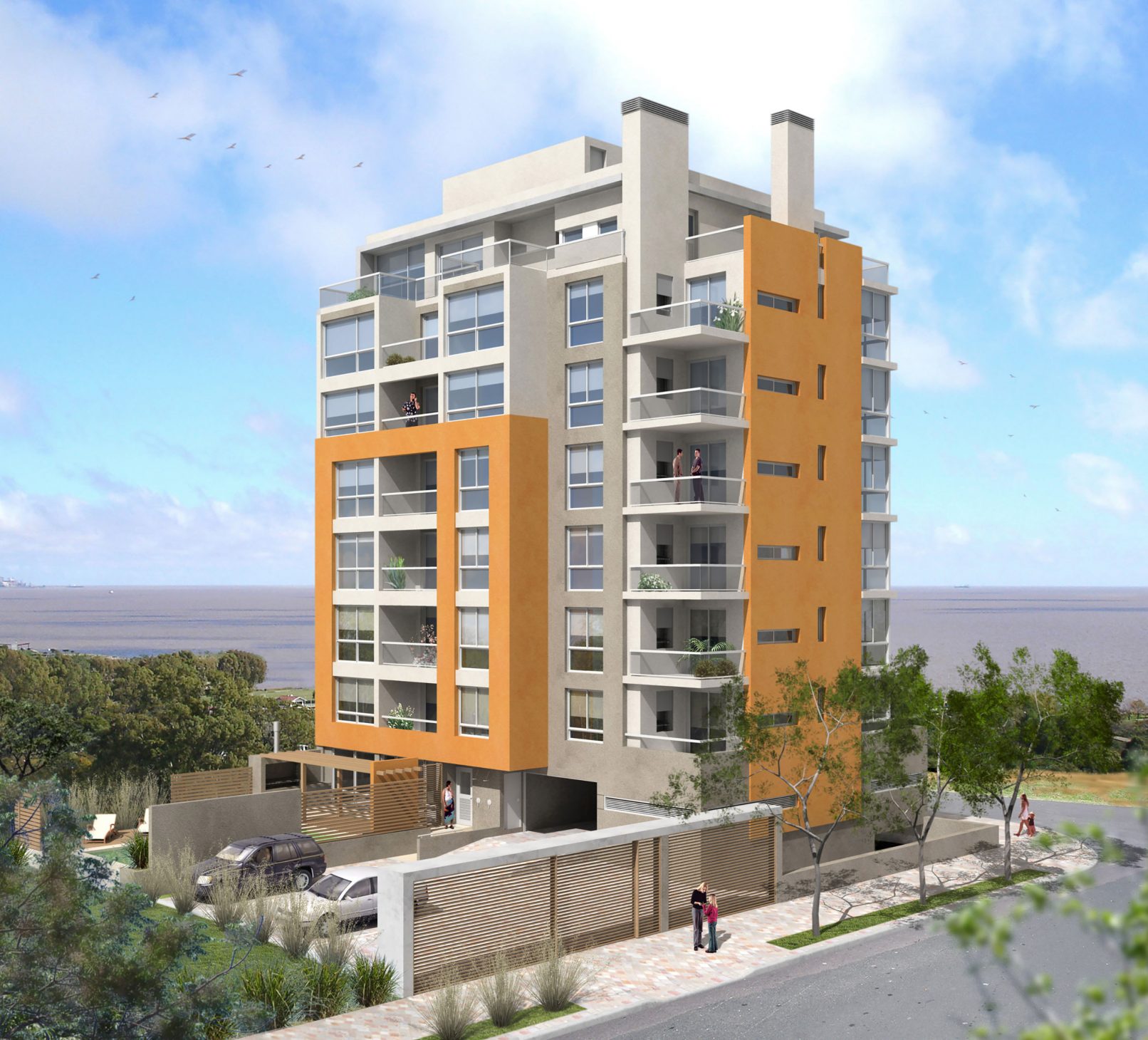 Las paredes serán de bloques cerámicos, y las terminaciones exteriores se realizarán con revoques proyectados con base acrílica, garantizando la permanencia del color y la resistencia al clima marítimo.