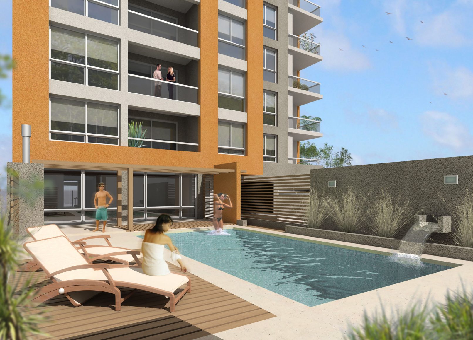 En Planta Baja se ubican la zona de acceso, y un SUM equipado con parrilla y baños, que se integra a la pileta, donde tendrán lugar los encuentros informales entre los usuarios del edificio.