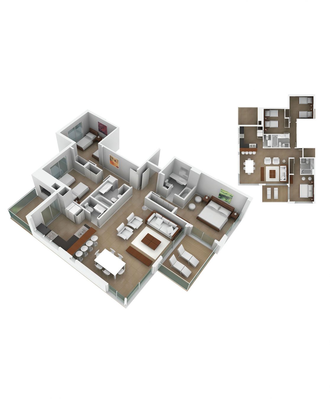 Los departamentos de 3 dormitorios ocupan la esquina con su zona de estar y comedor, a los que se agrega la cocina integrada. En el último piso el estar del penthouse se retira para dejar lugar a una amplia terraza con vistas a 3 lados.